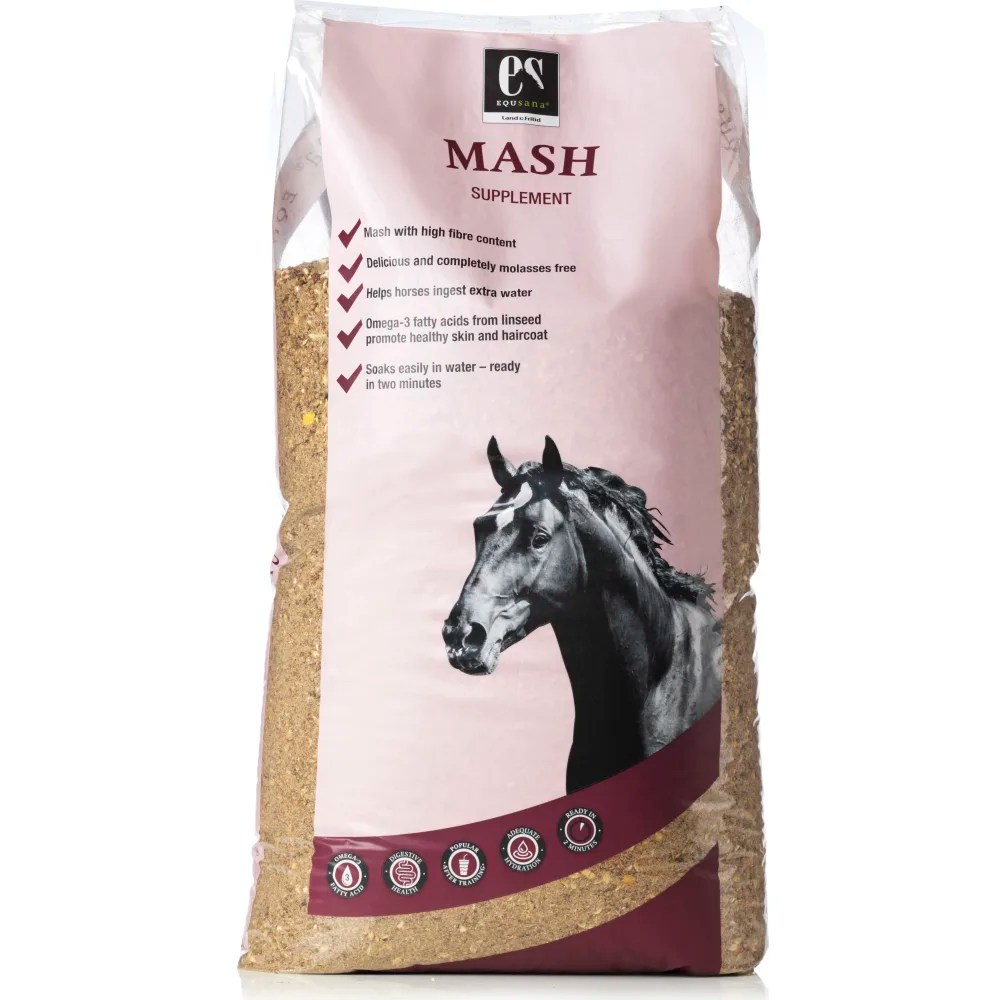 Equsana Mash er lavet udelukkende af gode sunde råvarer uden tilsatte vitaminer og mineraler – det betyder, at du kan anvende Mashen uden at det påvirker balancen i den daglige foderforsyning. Mashen har højt indhold af fordøjelige fibre fra bl.a. æbler og klid, der stimulerer tarmfunktionen, sammen med den tilsatte gærkultur. Den velsmagende Mash kan også bruges ved tildeling af medicin og kan hjælpe heste til at optage vand fx ved stævner og transport.